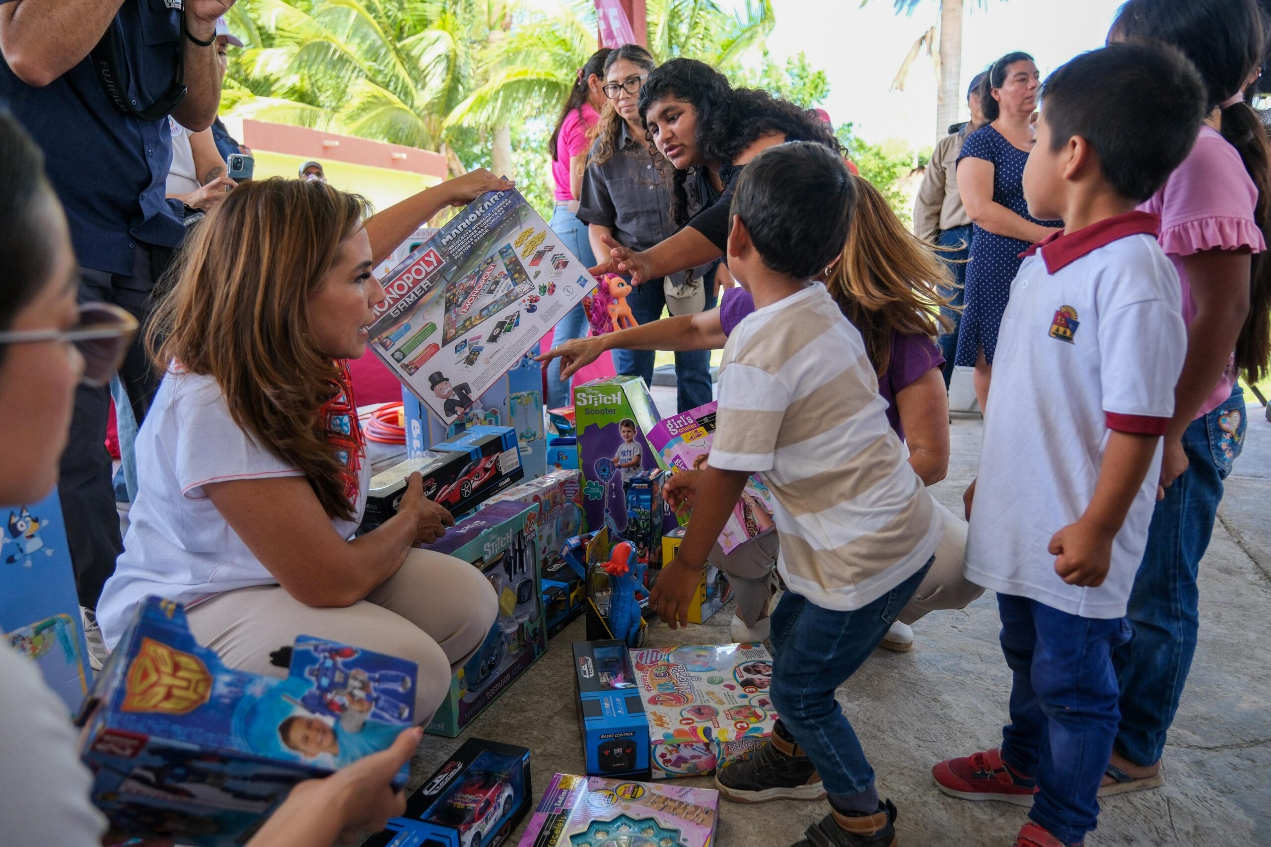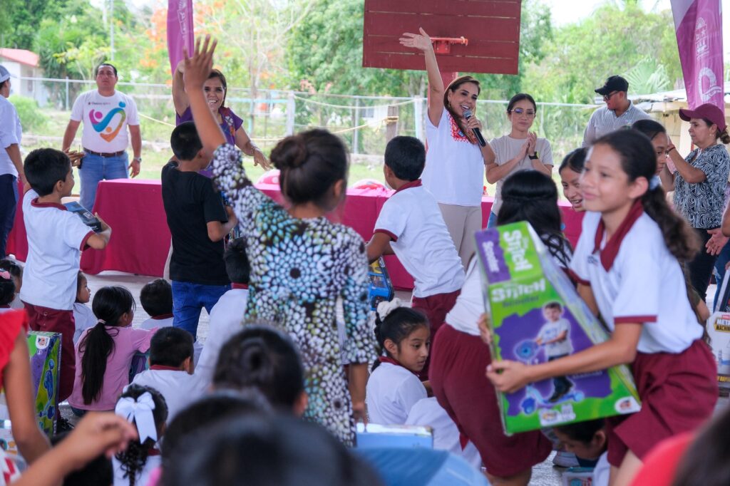 El domo de la escuela primaria “Felipe Carrillo Puerto” de esta comunidad se convirtió en un centro de diversión infantil con la presencia de la gobernadora Mara Lezama Espinosa y la presidenta honoraria del DIF Quintana Roo, Verónica Lezama Espinosa, quienes convivieron y entregaron juguetes a niñas y niños de Nuevo Canaán, California, Nuevo Bécar, Veracruz, Miguel Alemán y 5 de Mayo.
