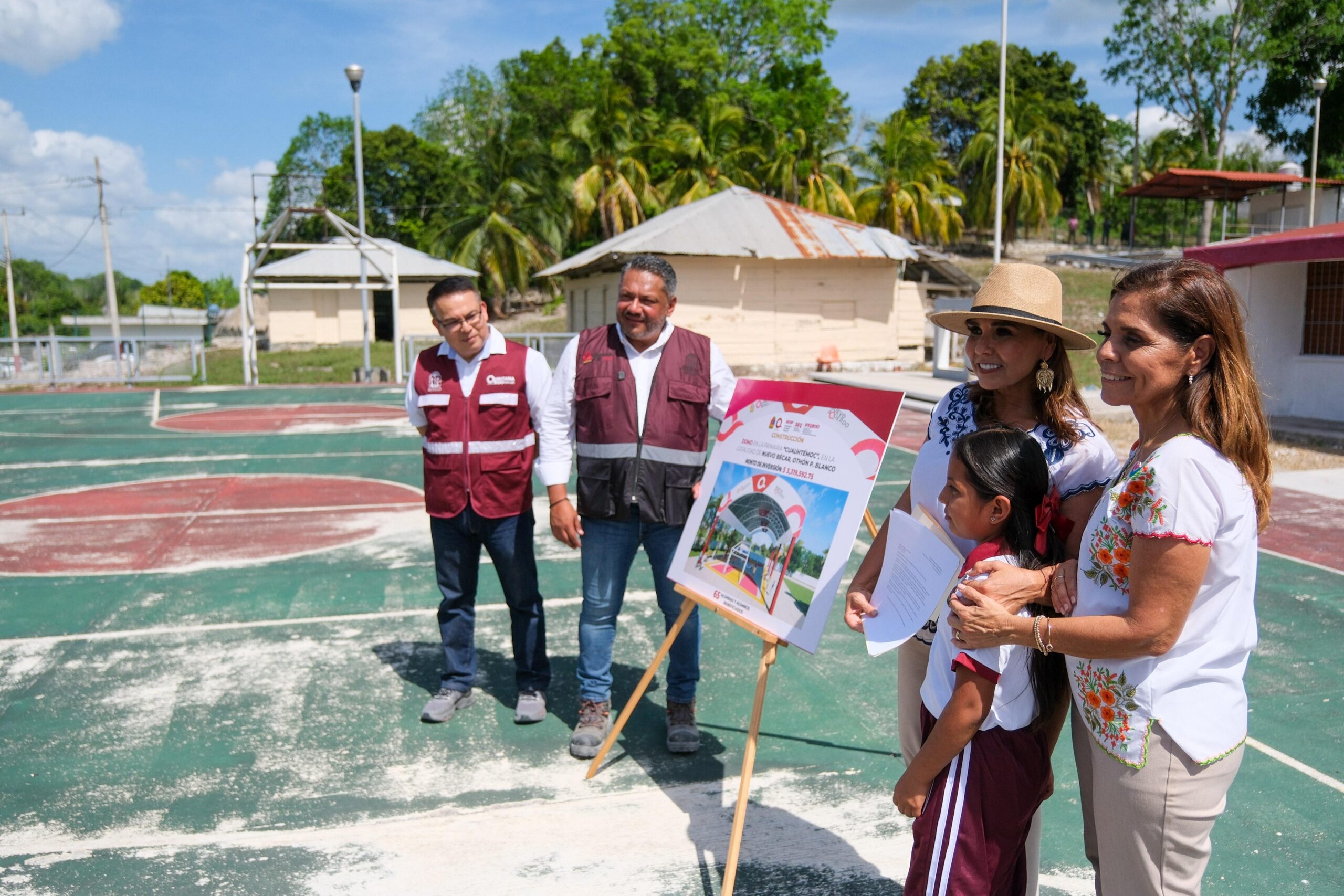 Acompañada de Yare, una alumna de 4º A de la escuela primaria “Cuauhtémoc” de esta comunidad, la gobernadora Mara Lezama Espinosa anunció la construcción de un domo para este plantel, en respuesta a una petición que la valiente niña le hiciera a la titular del Ejecutivo.