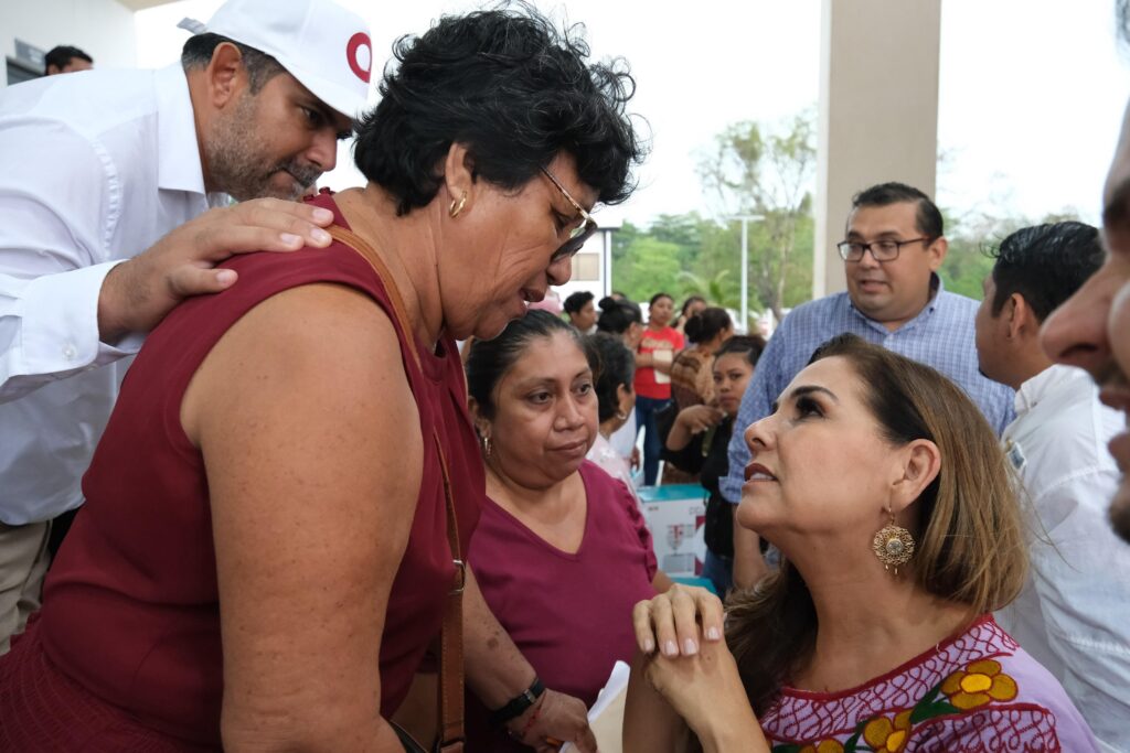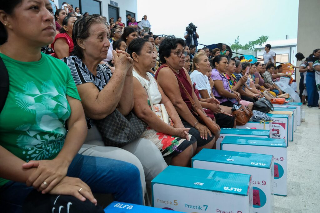 Acompañaron a la Gobernadora en el presídium la presidenta municipal de Othón P. Blanco, Yensunni Martínez Hernández; y las beneficiarias Lourdes Noemi Uh Alemán y Minerva Yam Ruiz.
