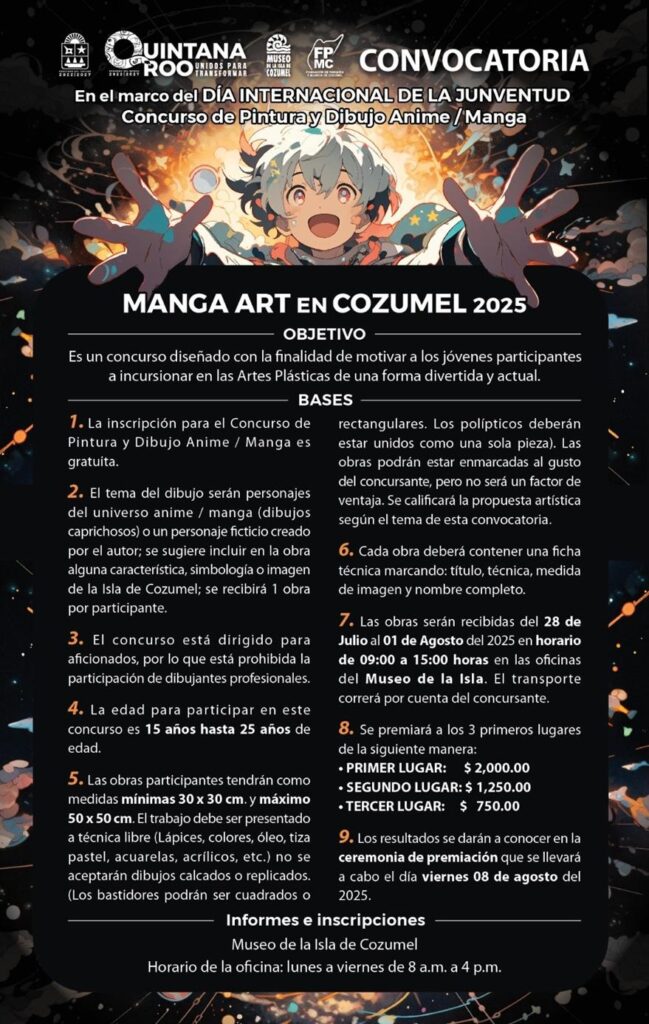 Para conmemorar el Día Internacional de la Juventud, la Fundación de Parques y Museos de Cozumel (FPMC) emitió la convocatoria para la segunda edición del concurso de pintura y dibujo “Manga Art en Cozumel 2025”, dirigido a jóvenes de entre 15 y 25 años interesados en el arte inspirado en el universo anime y manga.