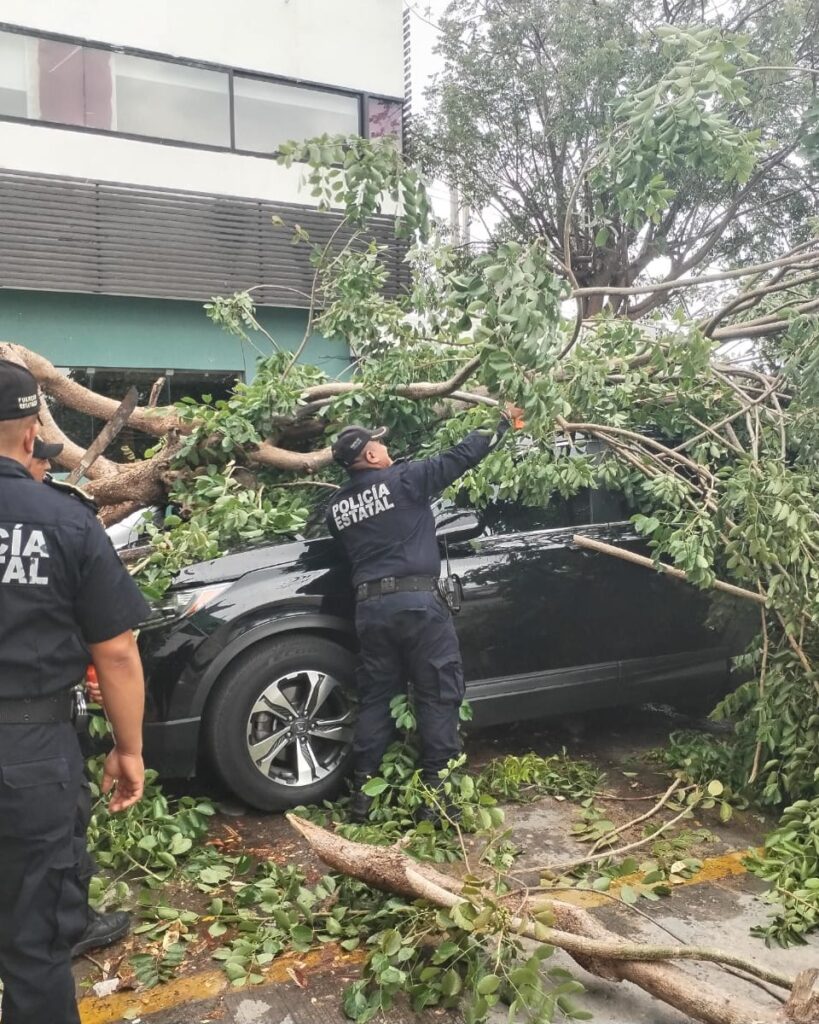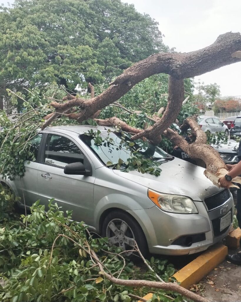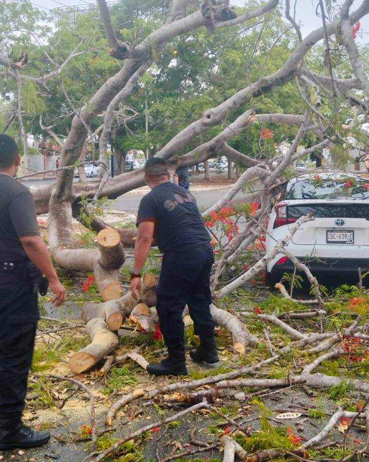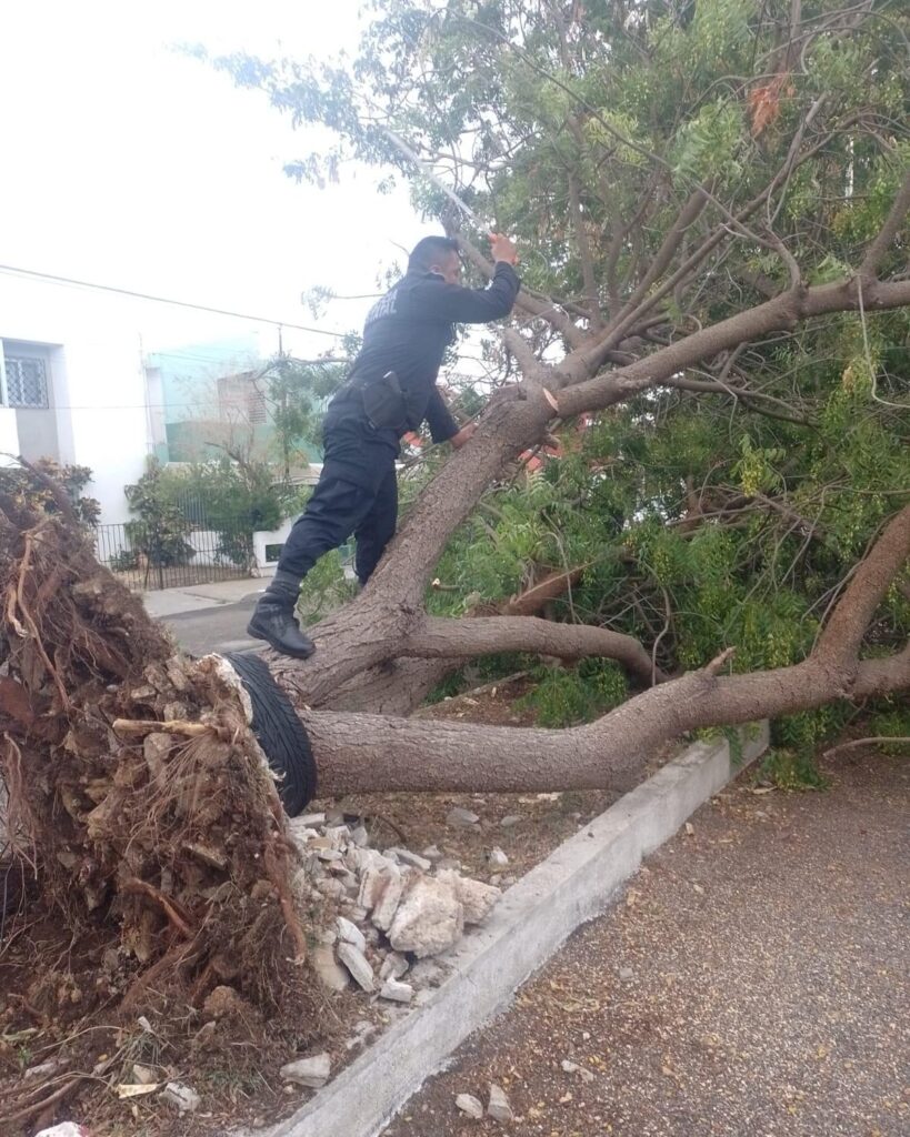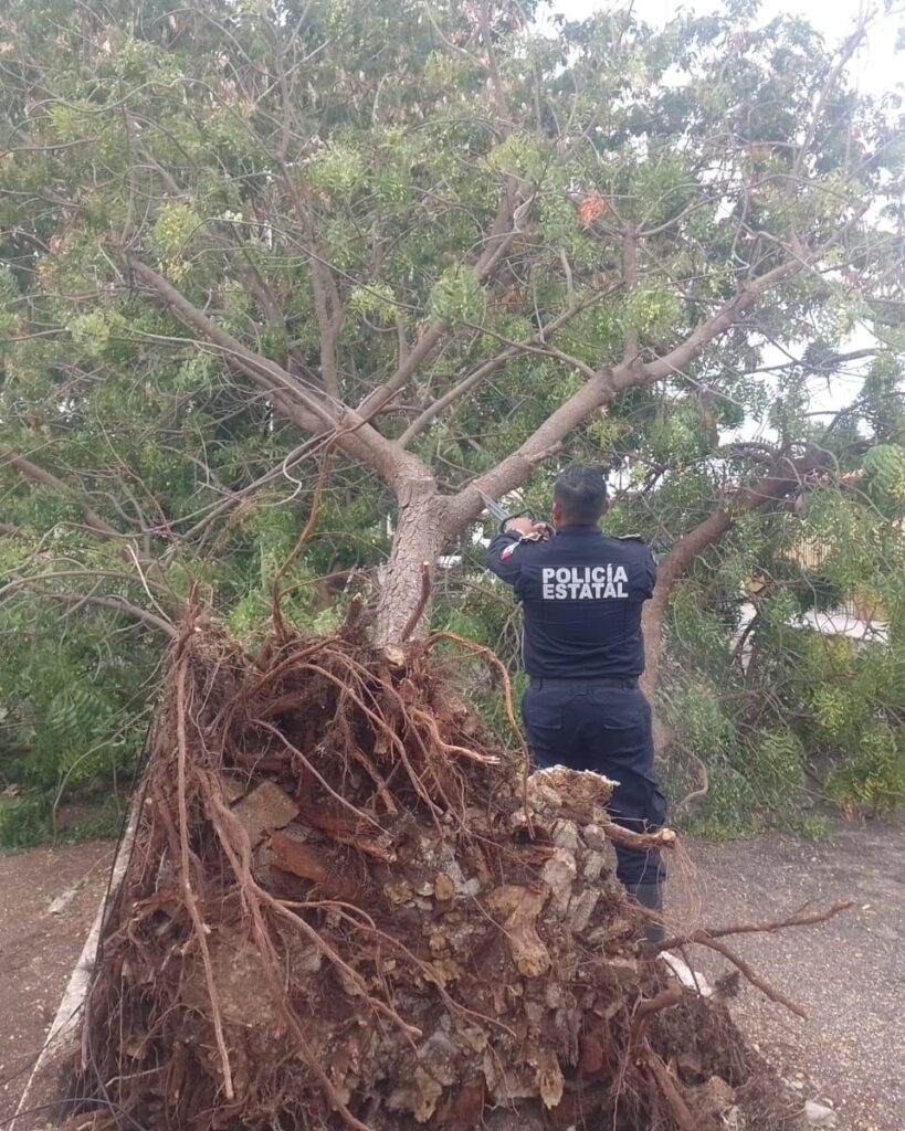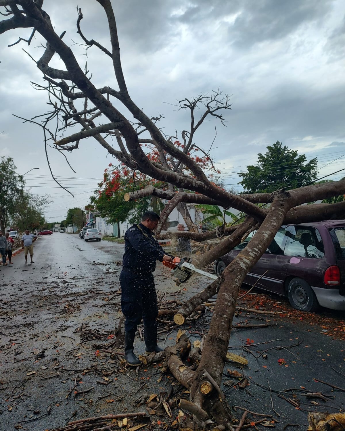Elementos de la SSP realizaron labores de limpieza por caída de árboles en colonias como Juan B. Sosa, Cordemex, Rinconada de Chuburná y en el estacionamiento de una plaza. Se retiraron árboles que obstruían la vía pública o que habían caído sobre vehículos.