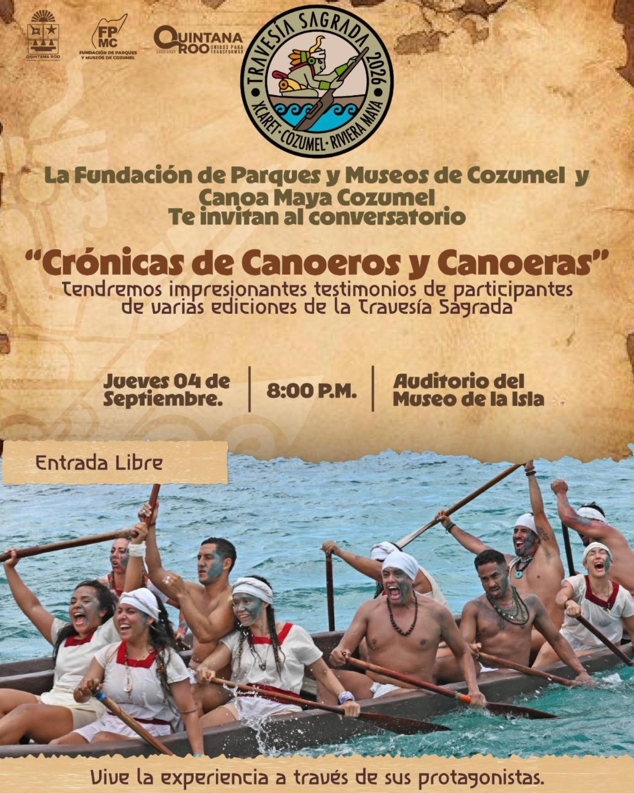 La Fundación de Parques y Museos de Cozumel (FPMC) y el Grupo Canoa Maya invitan a la comunidad al conversatorio “Crónicas de Canoeros y Canoeras”, un espacio en el que mujeres y hombres que han participado en la Travesía Sagrada compartirán sus testimonios y experiencias de vida.