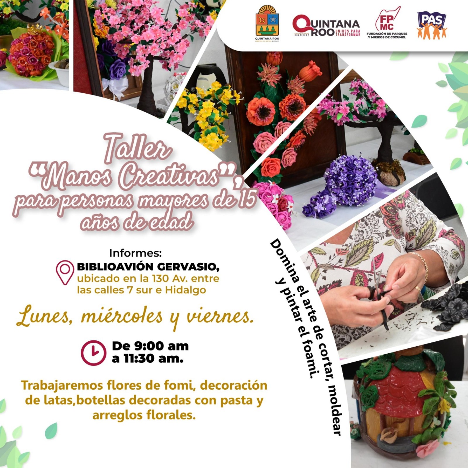 La Fundación de Parques y Museos de Cozumel (FPMC) invita a personas mayores de 15 años a inscribirse al taller gratuito “Manos Creativas”, que se impartirá los días lunes, miércoles y viernes de 09:00 a 11:30 horas en el BiblioAvión Gervasio.