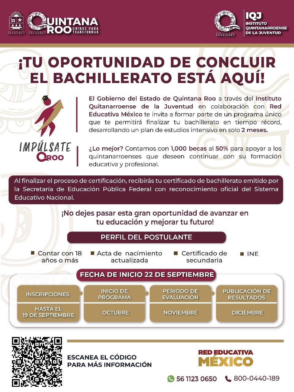 El Gobierno del Estado a través del Instituto Quintanarroense de la Juventud (IQJ), que encabeza Alma Alvarado Moo, en coordinación con Red Educativa México, dio a conocer la apertura de una nueva convocatoria del programa “Impúlsate Quintana Roo”, orientado a personas mayores de 18 años que deseen finalizar sus estudios de nivel medio superior en un periodo intensivo de sólo dos meses.