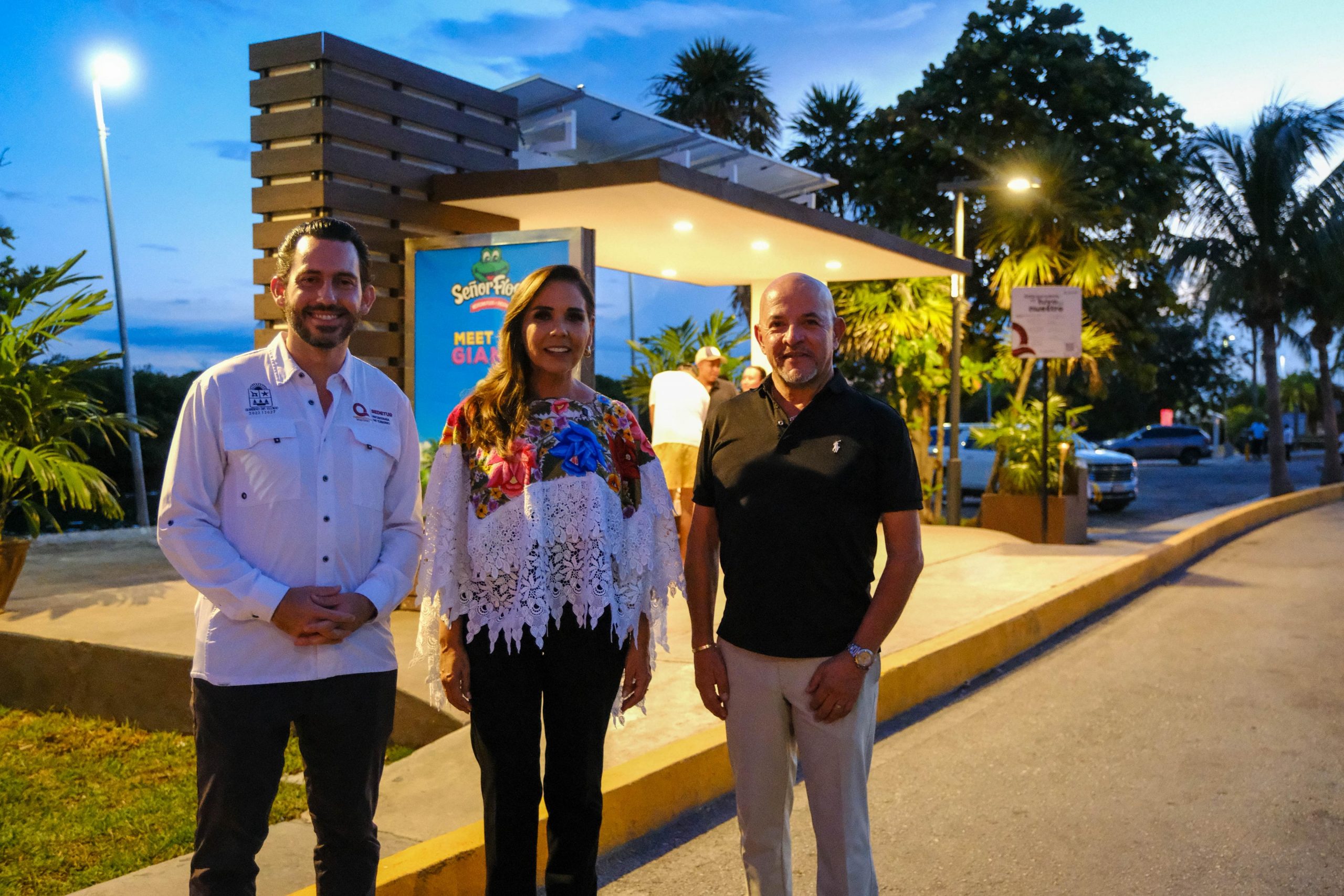 La titular del Ejecutivo supervisó que 42 paraderos estén mejor iluminados, dignos, más seguros para todas y todos, acompañada por el secretario de Turismo, Bernardo Cueto Riestra, y el titular del Fideicomiso para el Fortalecimiento de la Actividad Turística de Quintana Roo (FOATQROO), Ricardo Archundia.